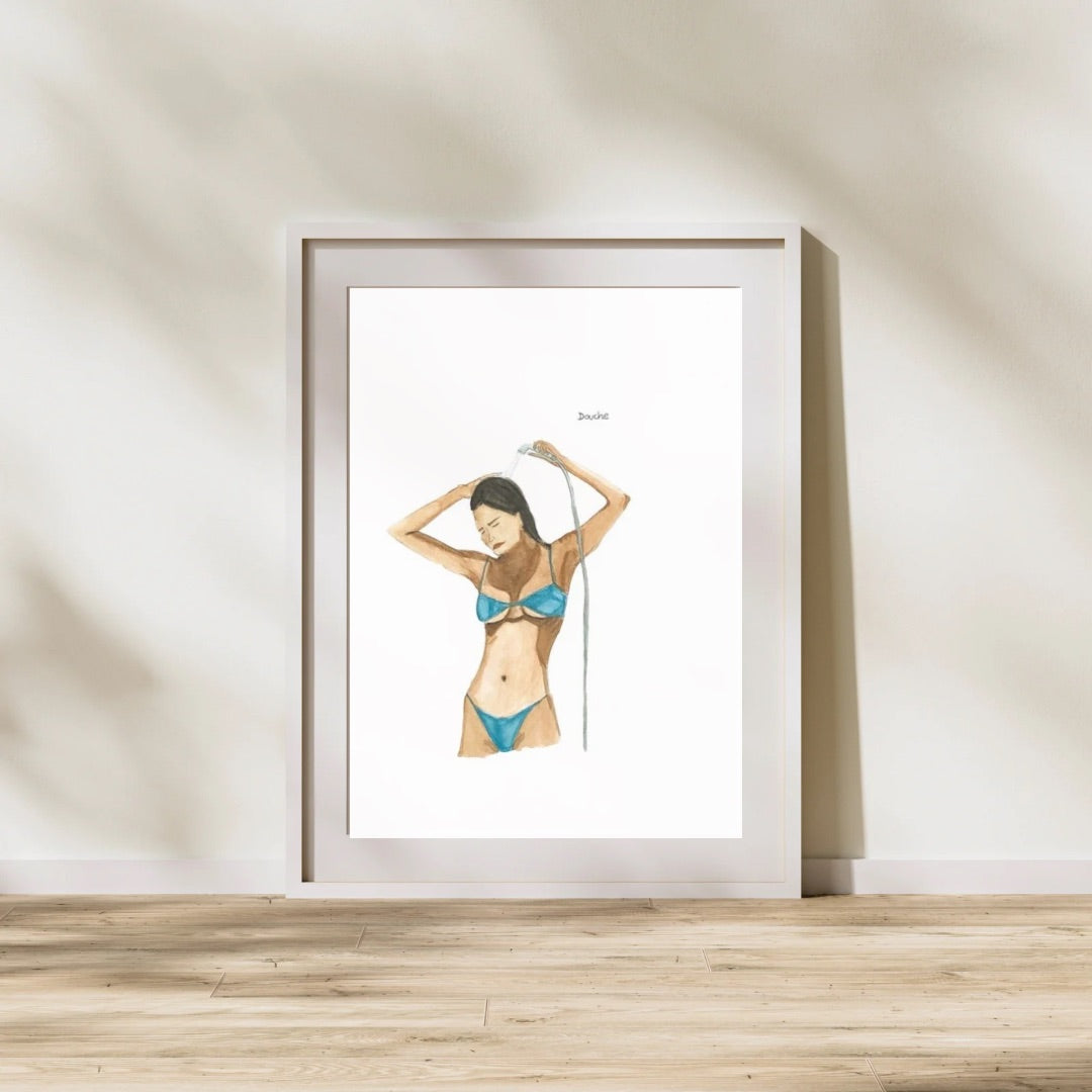 Fraicheur d'été, un maillot bleu océan, peau mouillée sous la douche brulante.