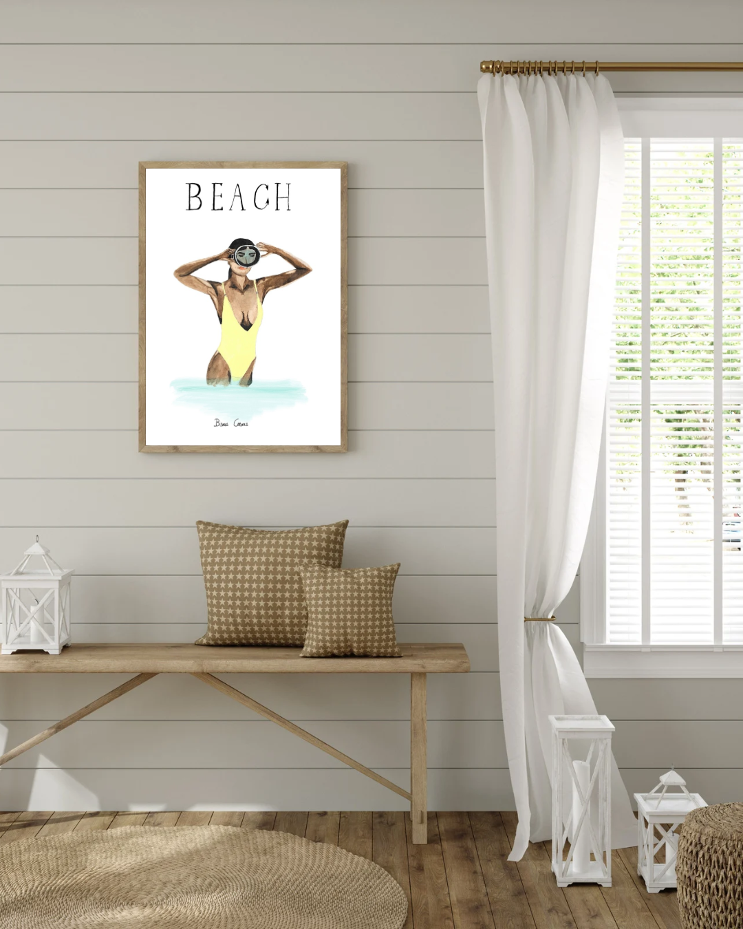 Sortie de l'eau sous le soleil, son masque de plongée encore brillant, elle incarne l'aventure et la fraîcheur des journées d'été.